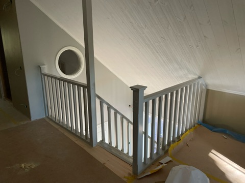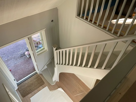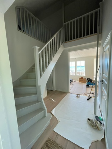 Klassisk trappa i målad furu Trappa till bättre sommarstuga. Profilerad framkantsnos, fasade räckesståndare och stolpar. Handledare i omega. En av de våra mest tillverkade trappor. 24/10, 2025 av Sörbins